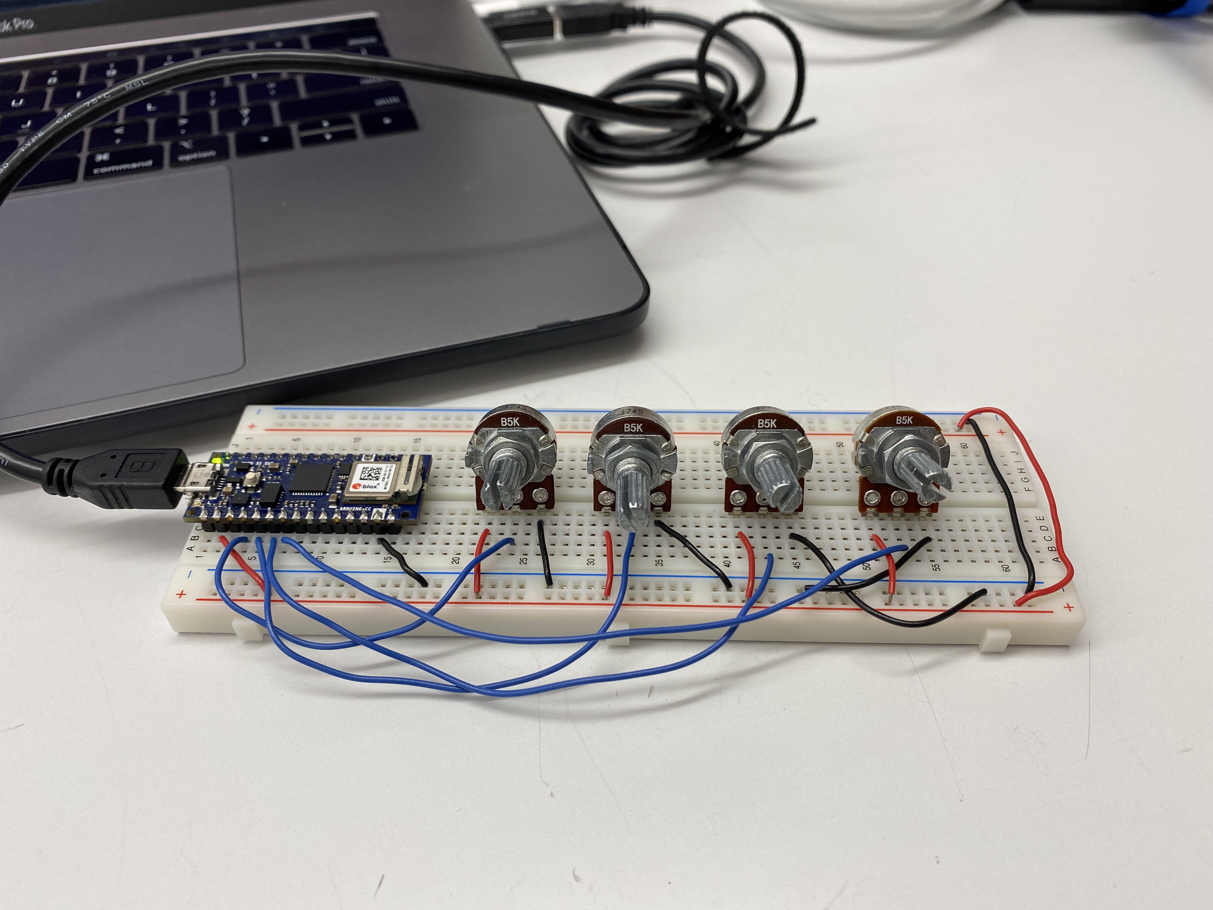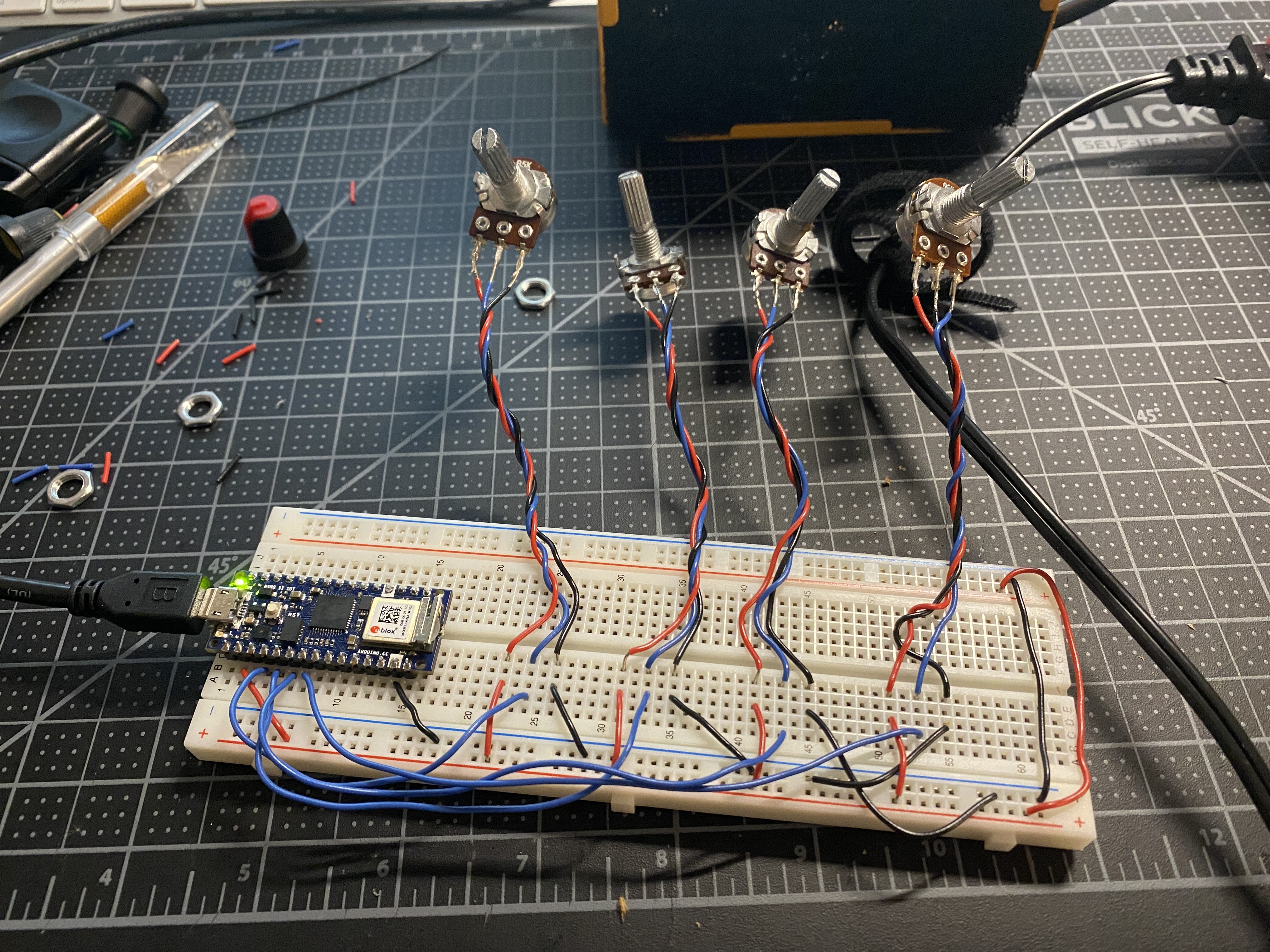 Next, I added three more potentiometers for a total of four variable resistors.