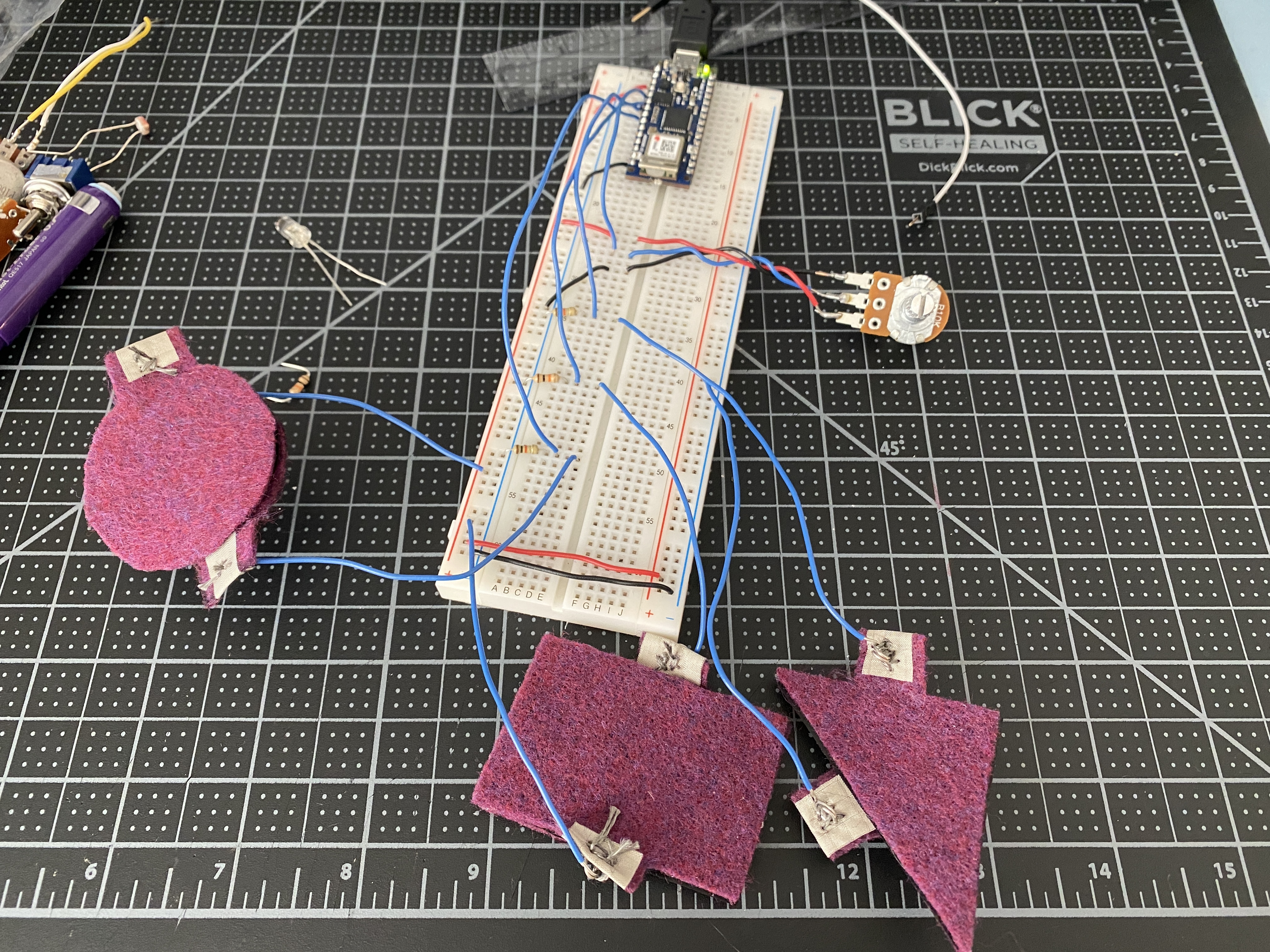 sensors into my project, and so below I have three textile sensors along with