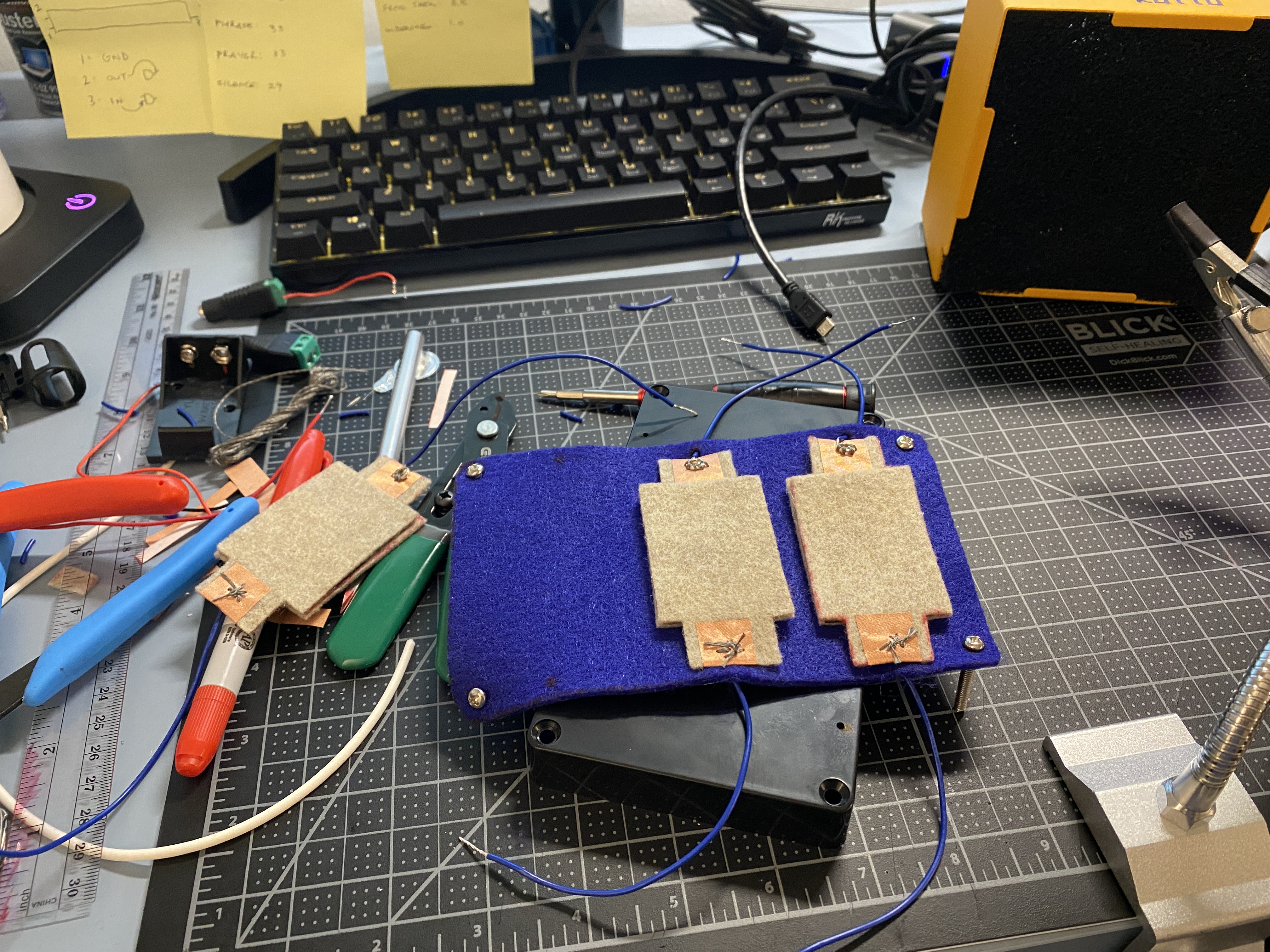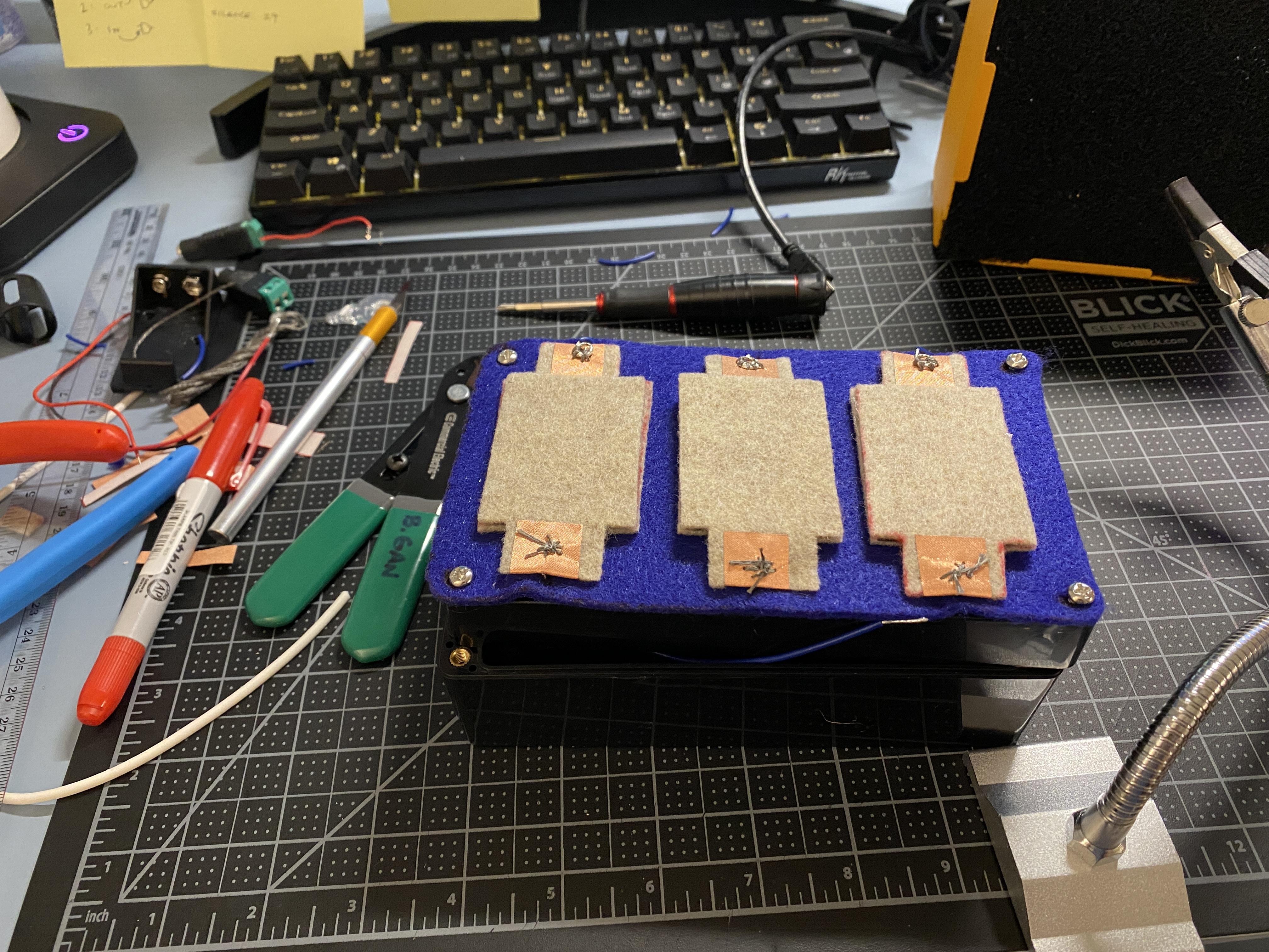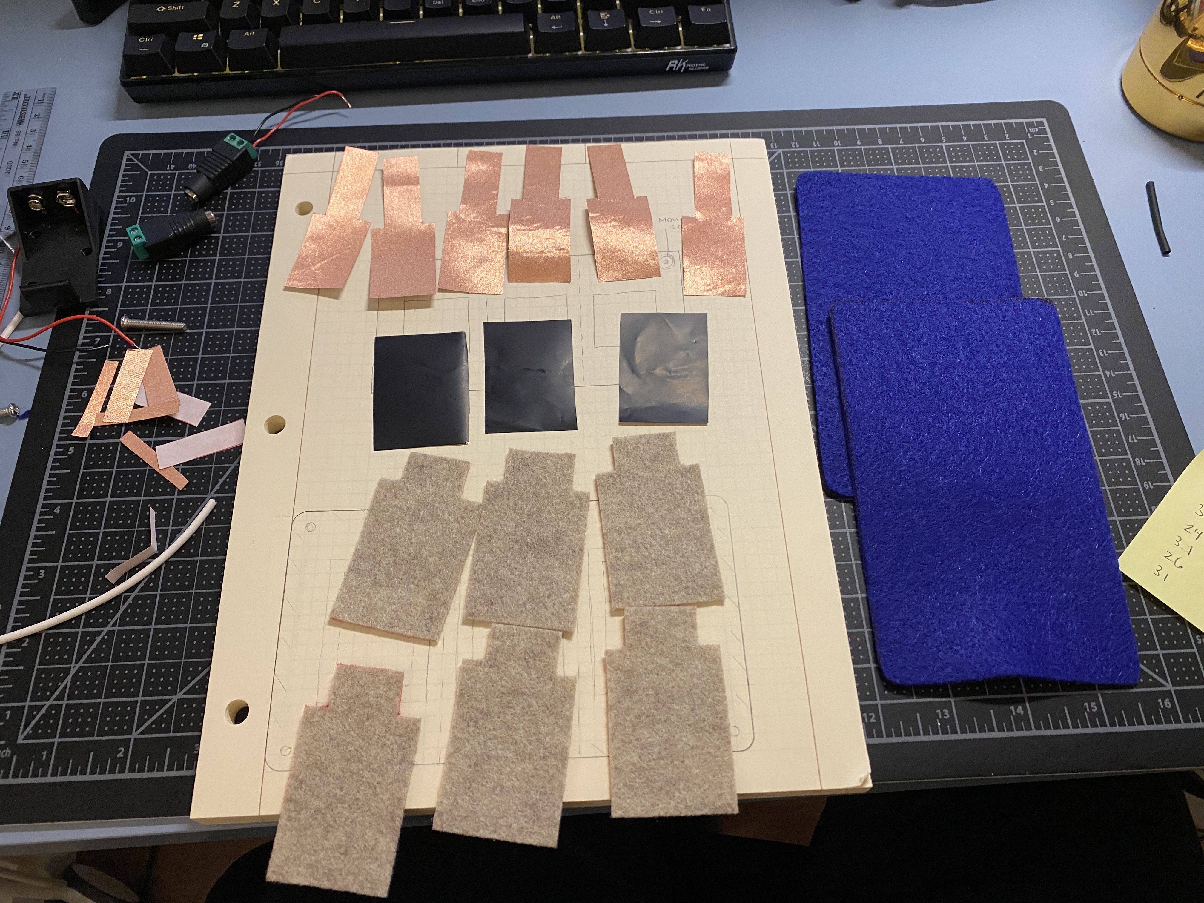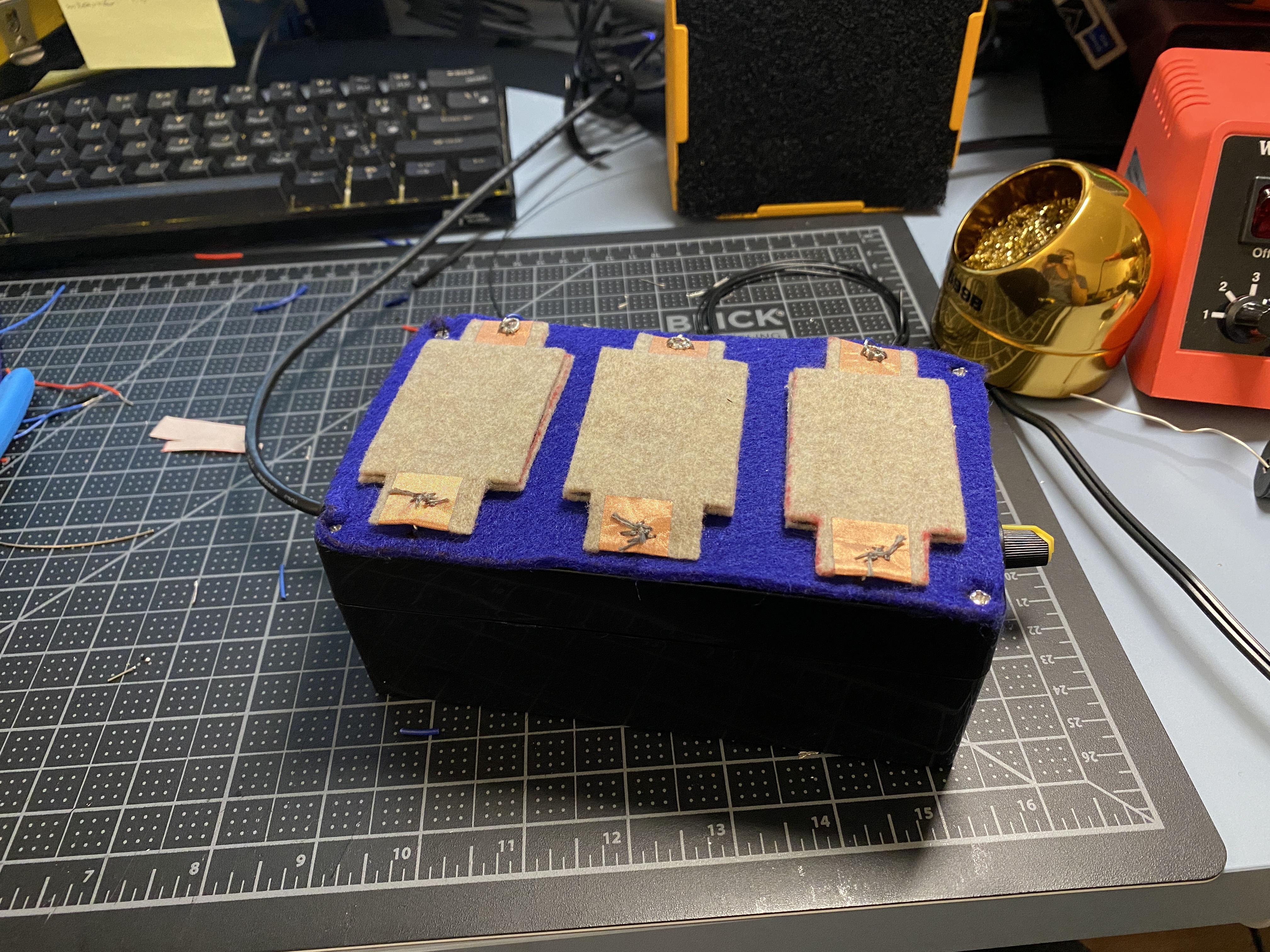 pad/piece of felt, with a top layer of felt, with each sensor separated by a