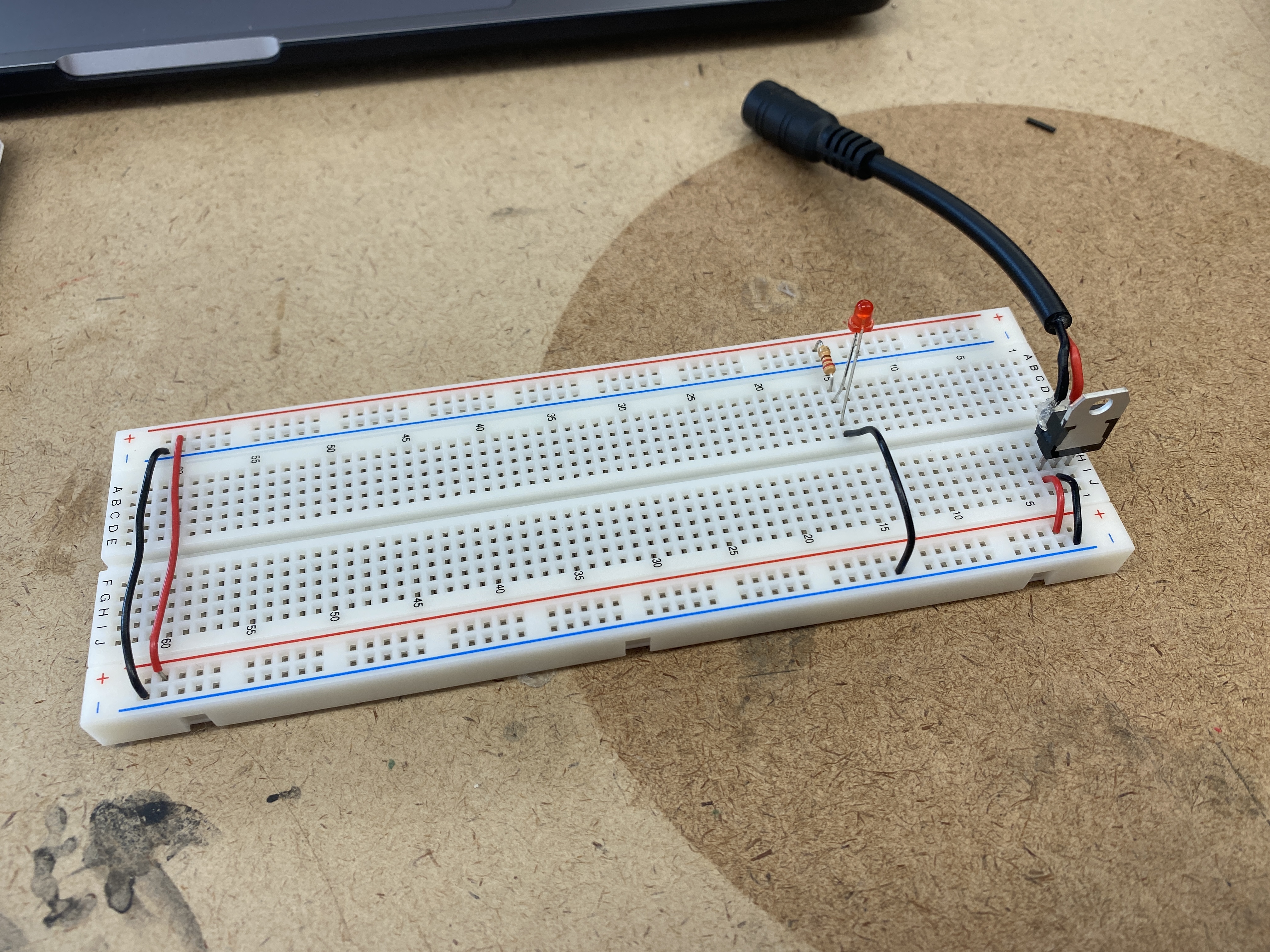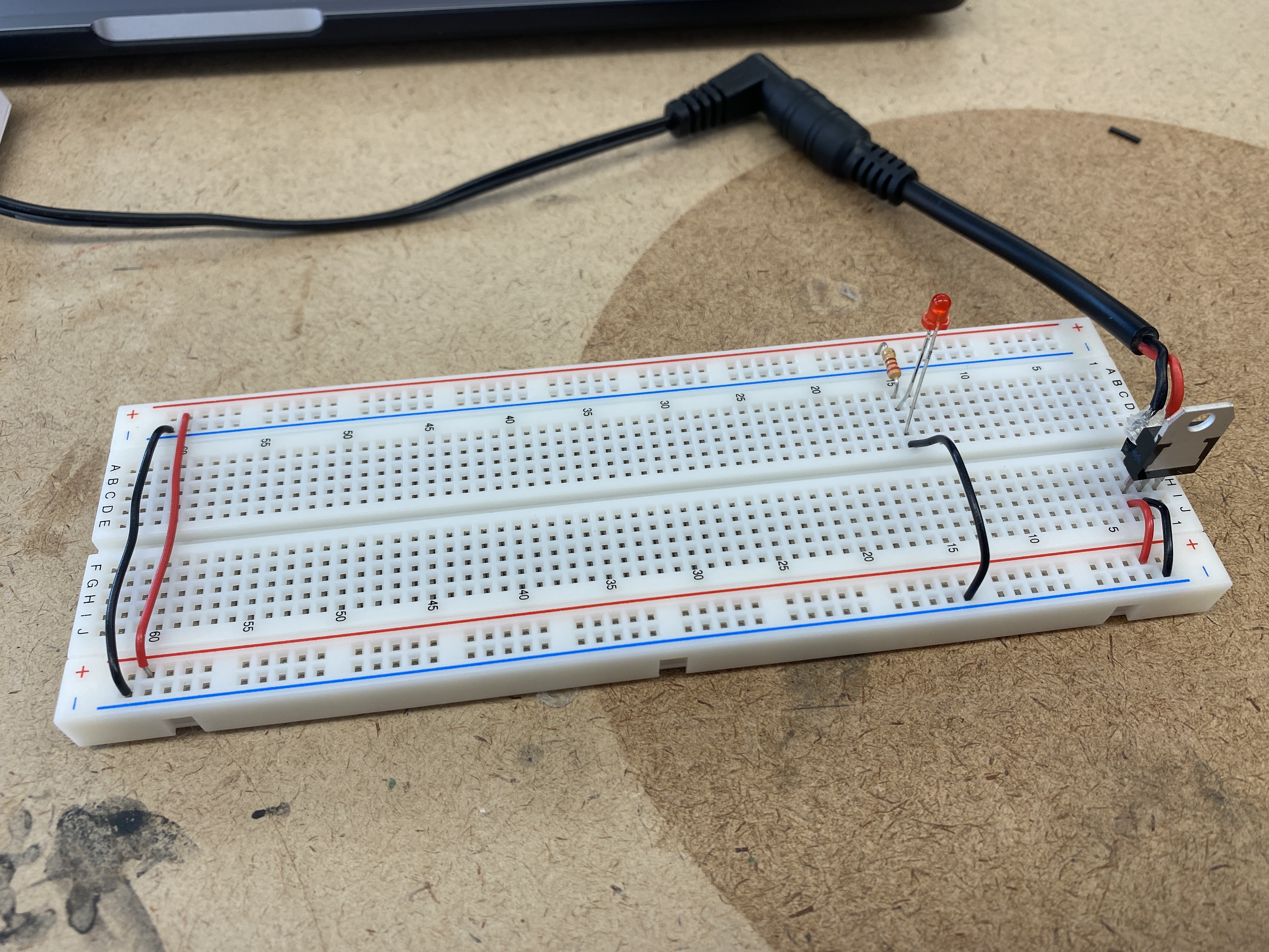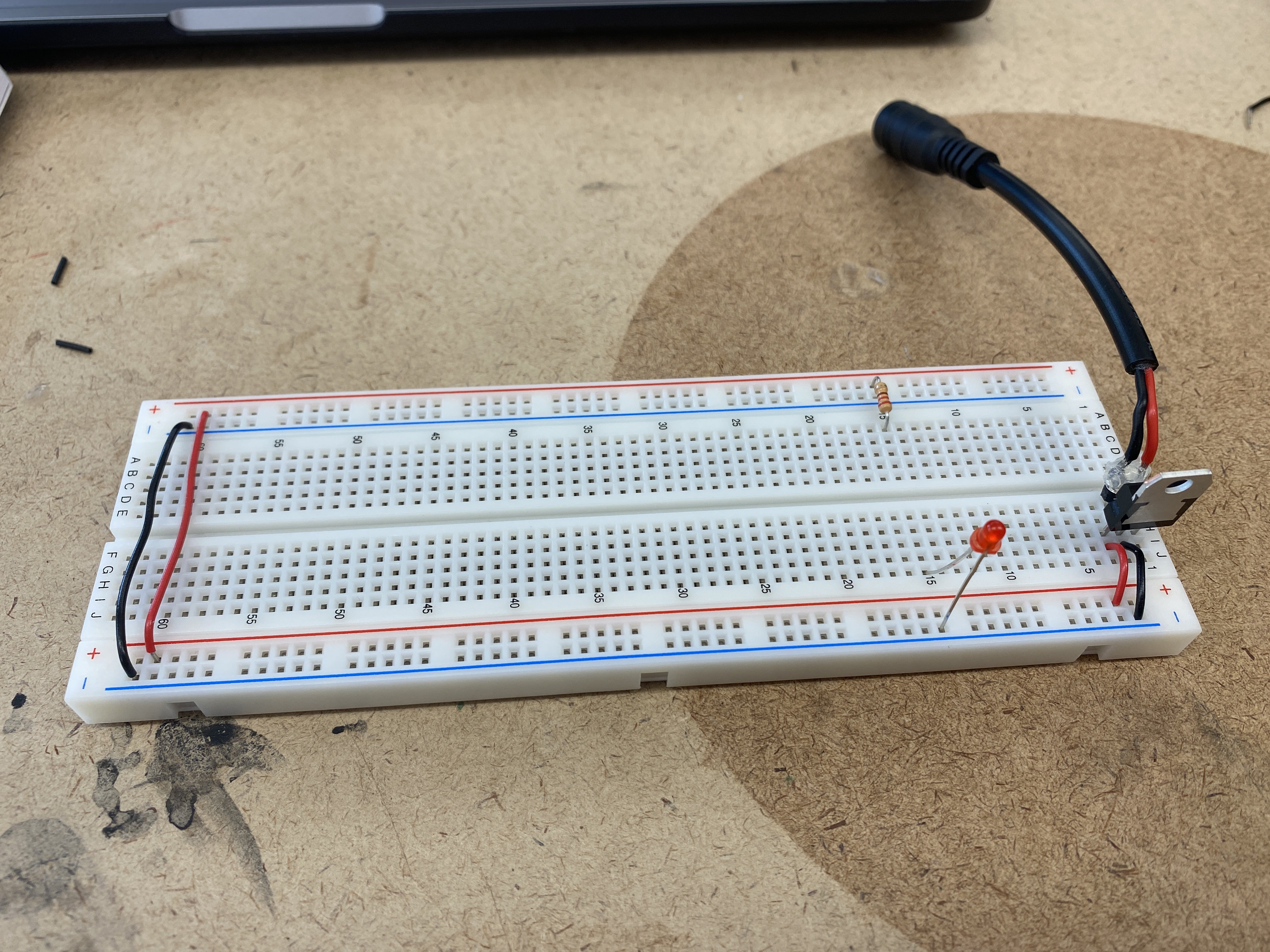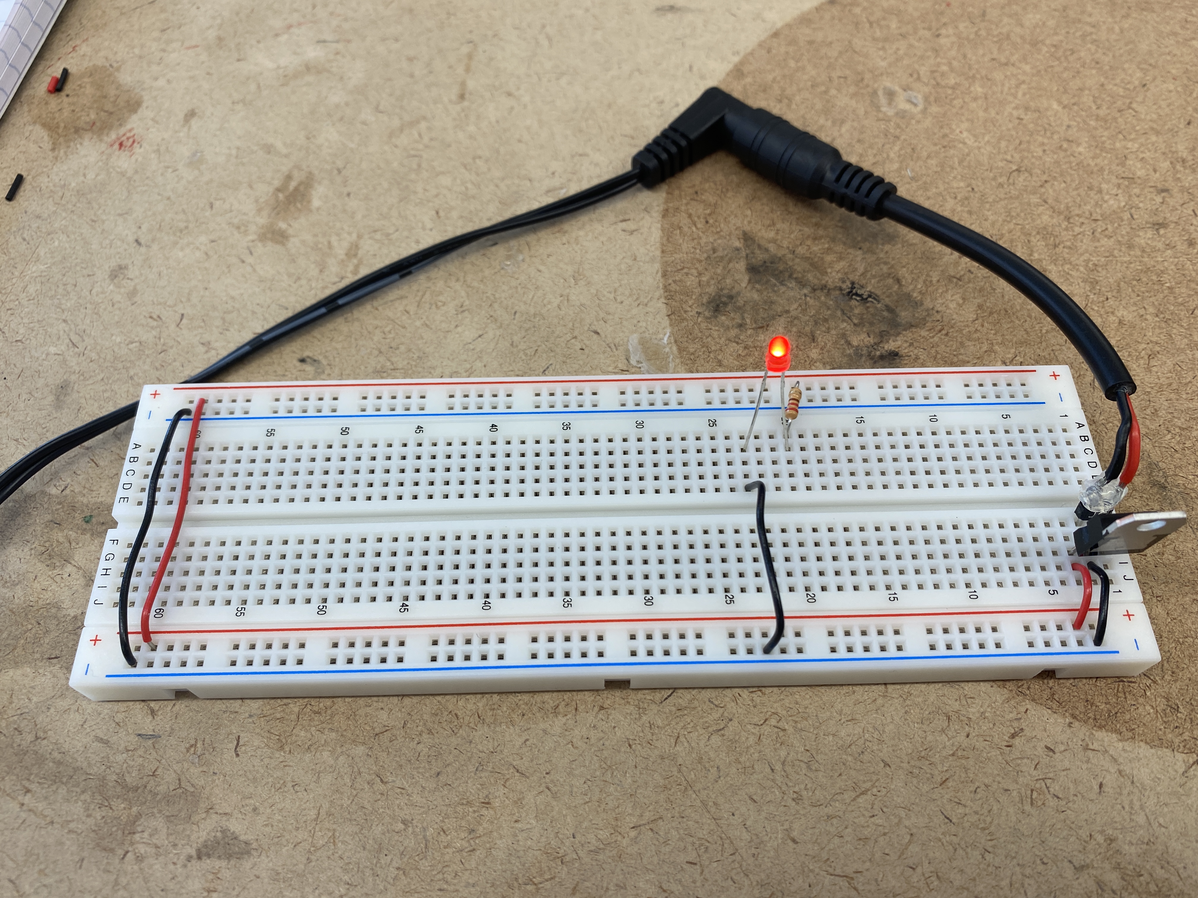 the breadboard's voltage bus. I did a test adding a switch and an LED off of the 5V regulator.