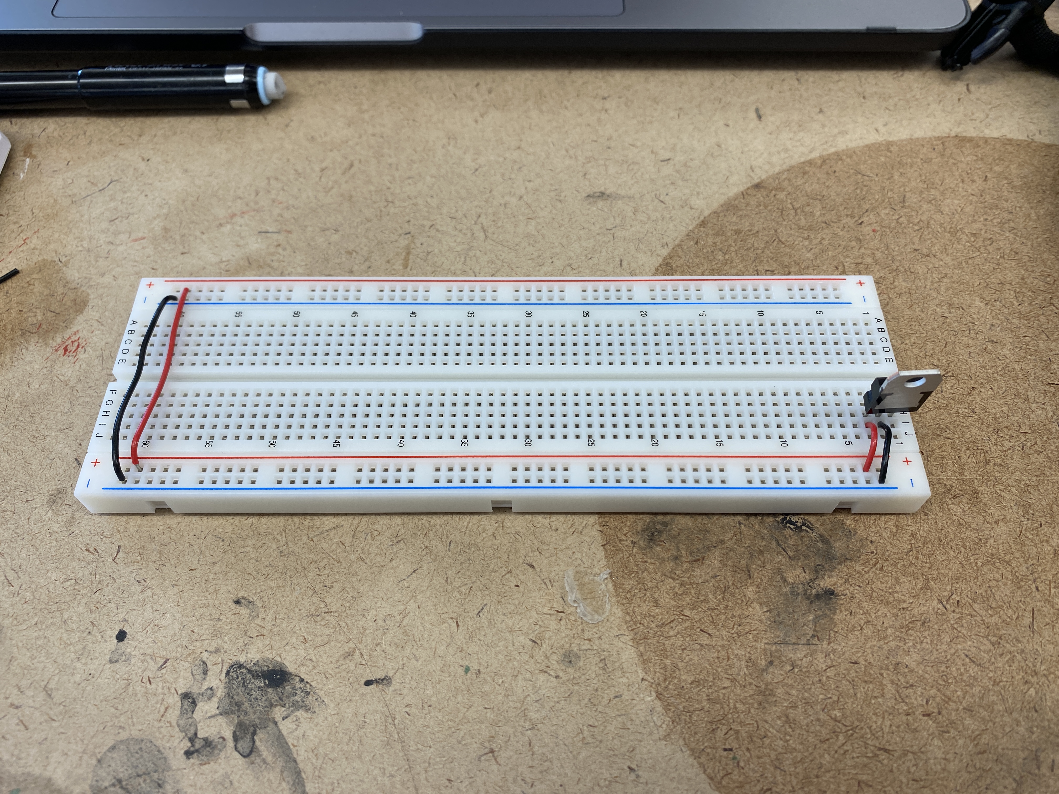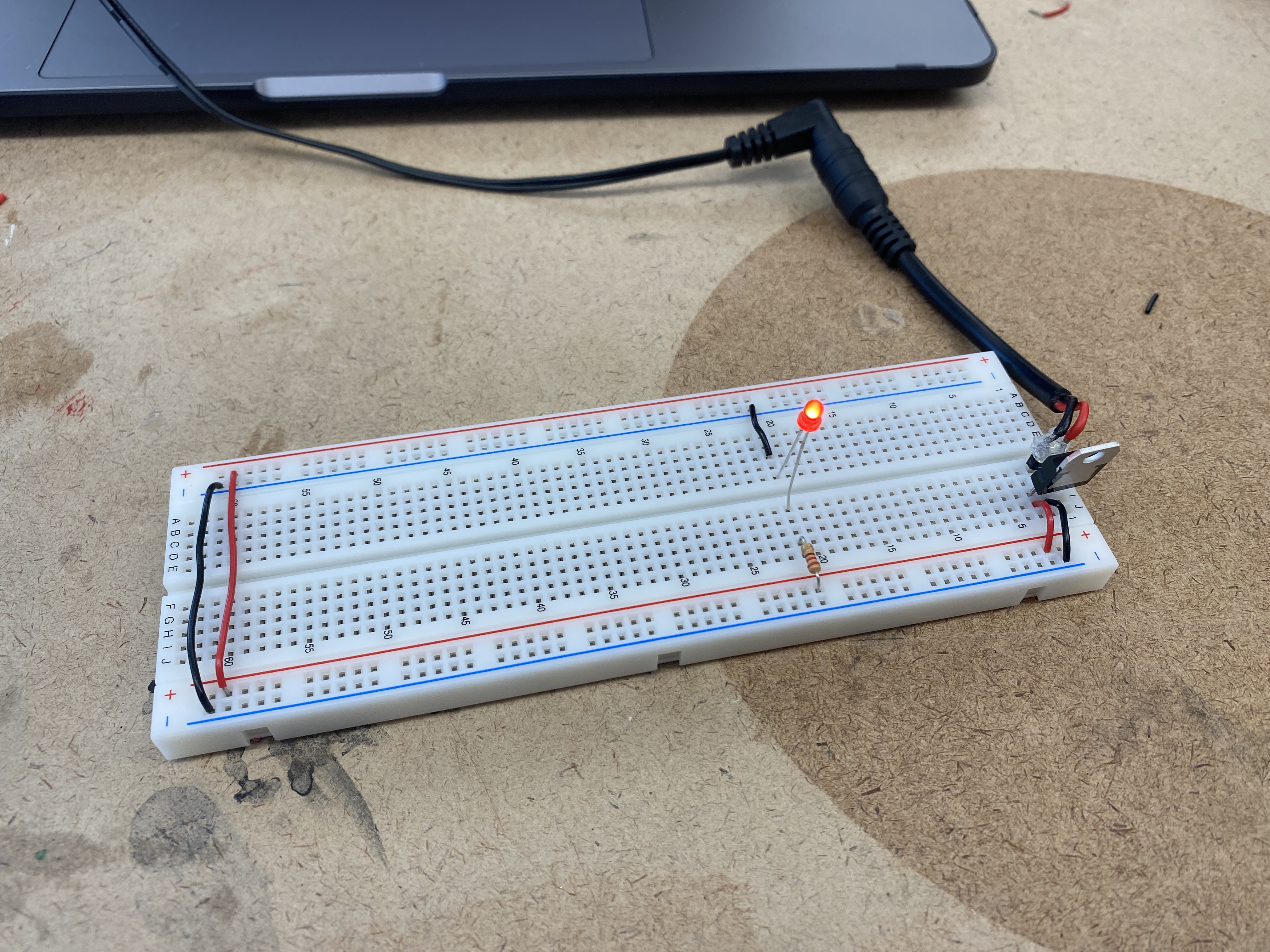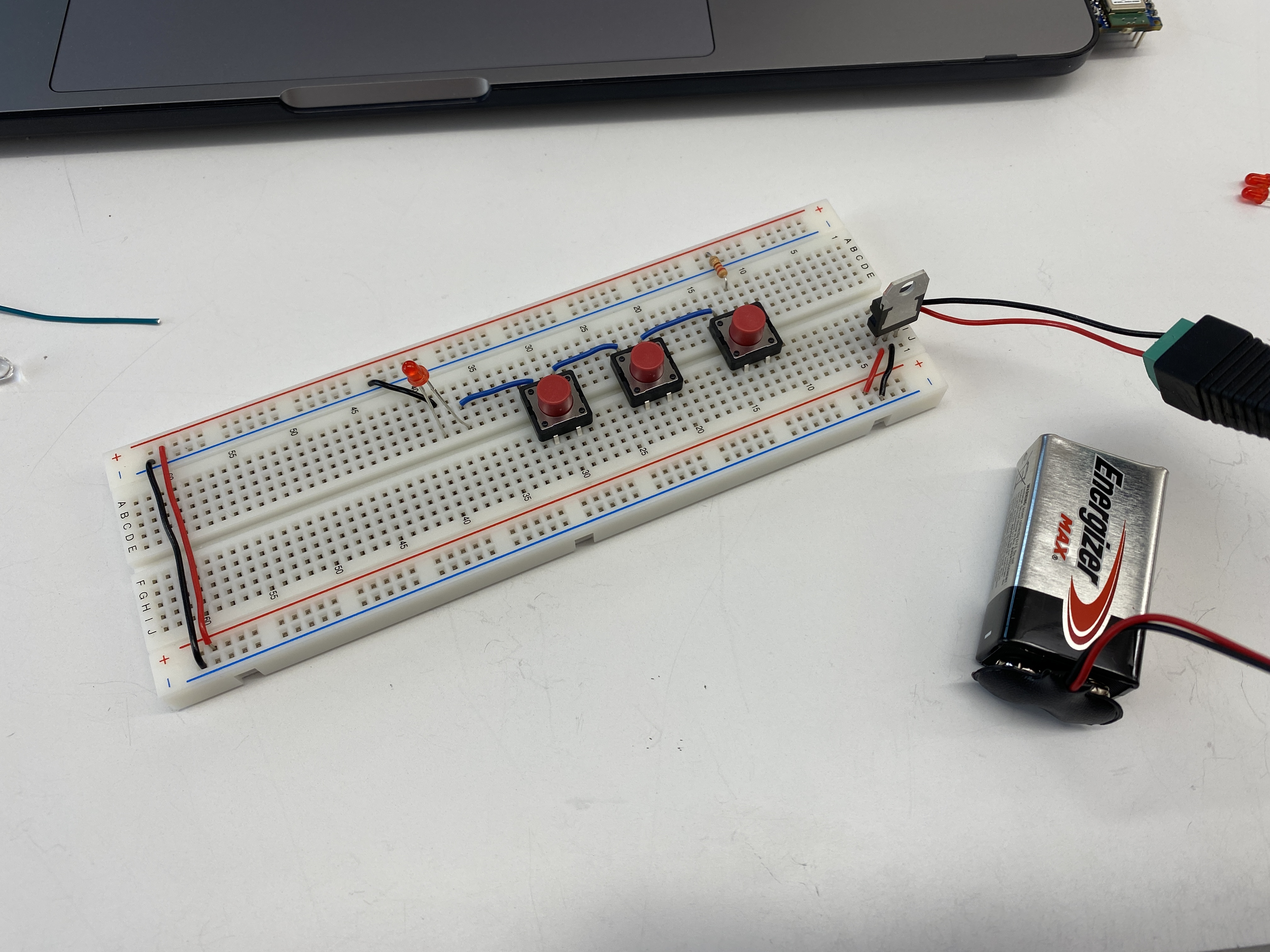 the breadboard's voltage bus. I did a test adding a switch and an LED off of the 5V regulator.
