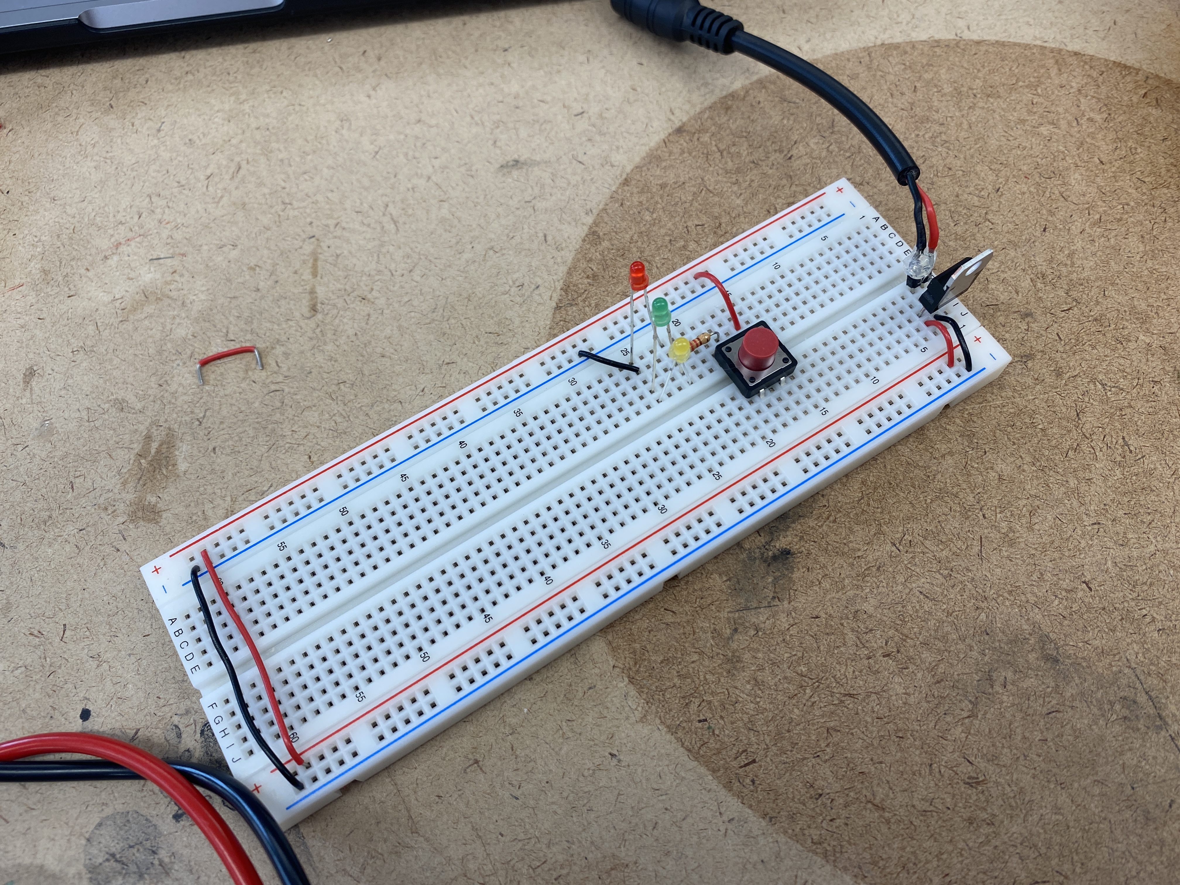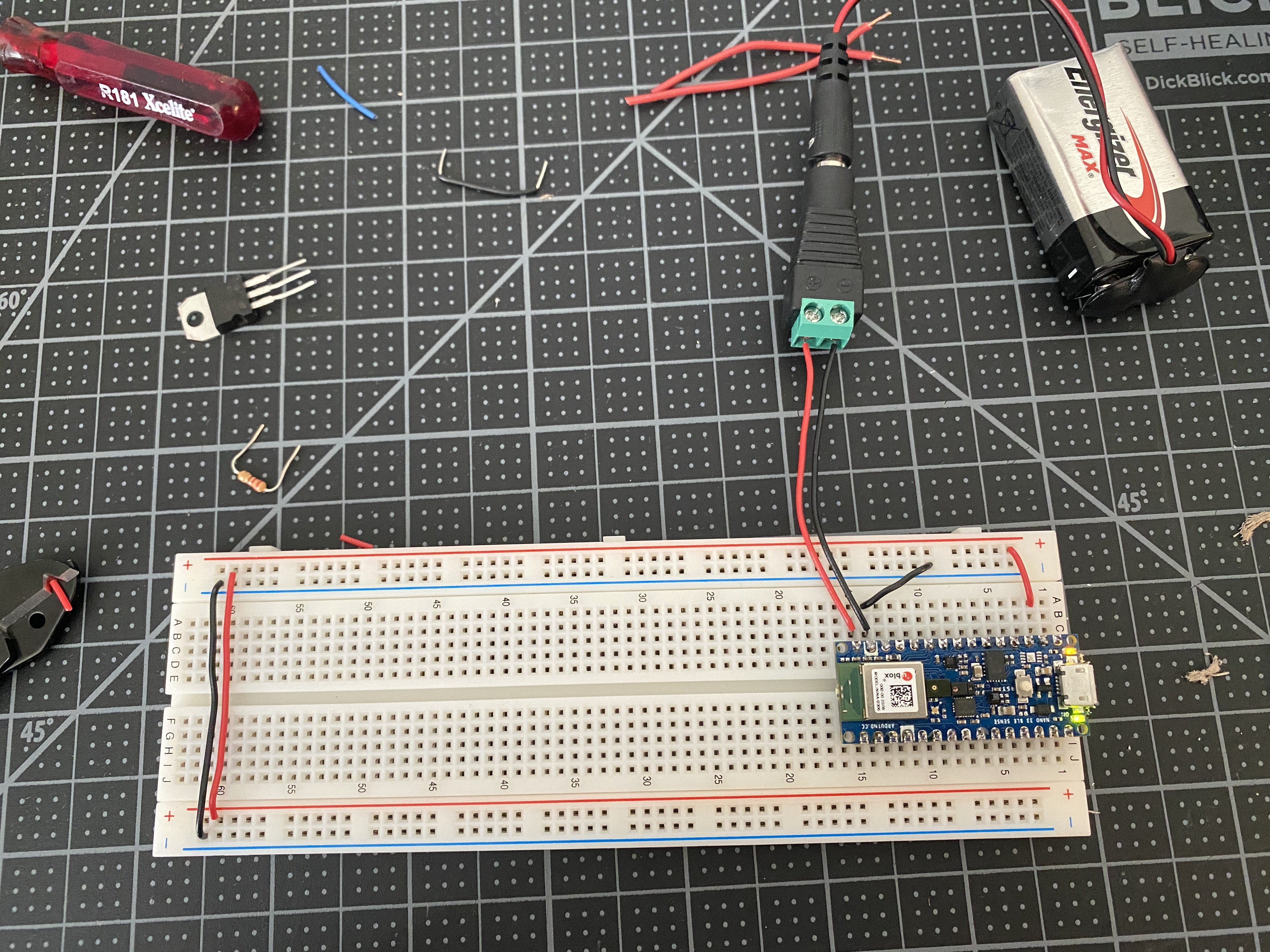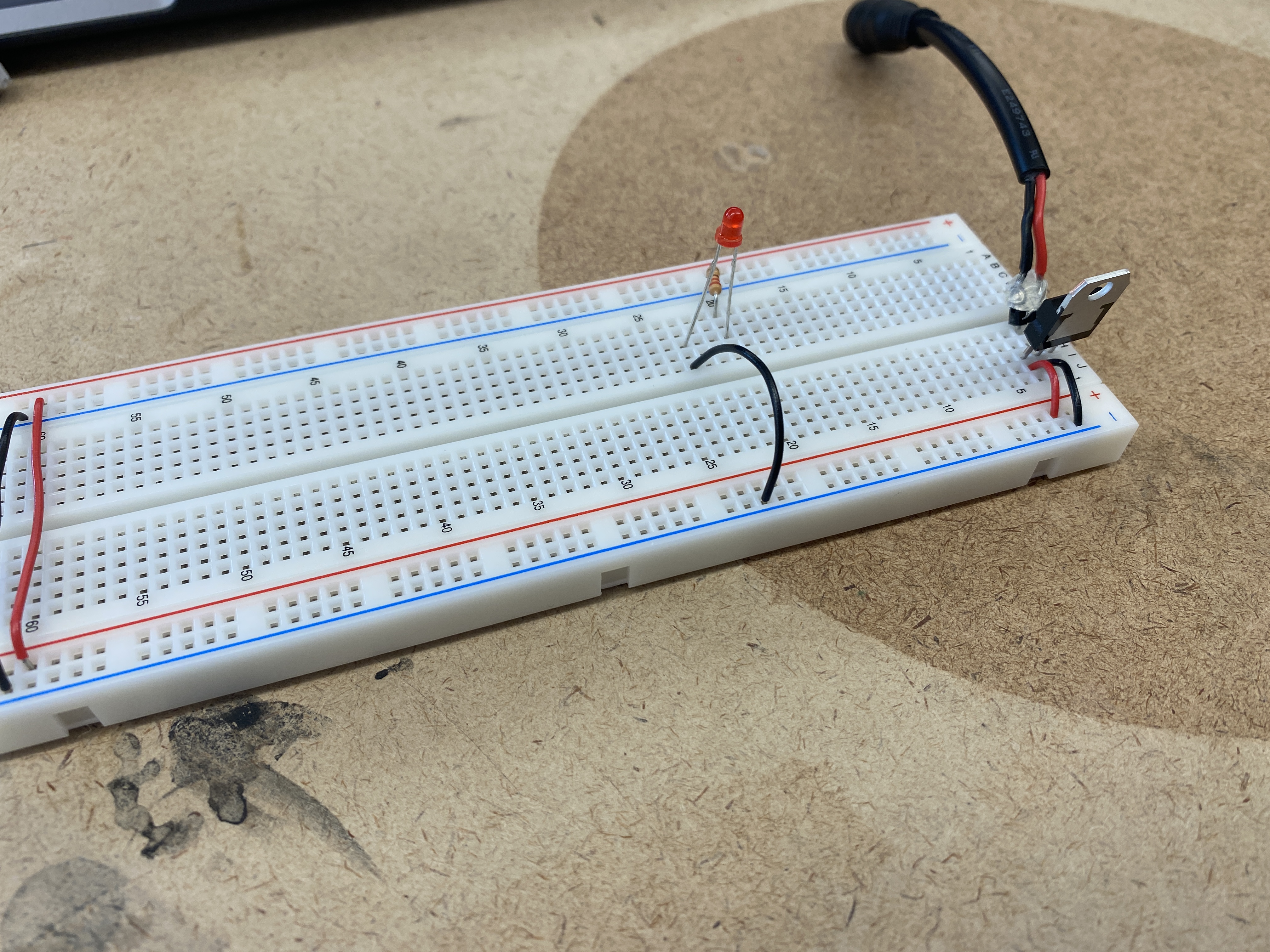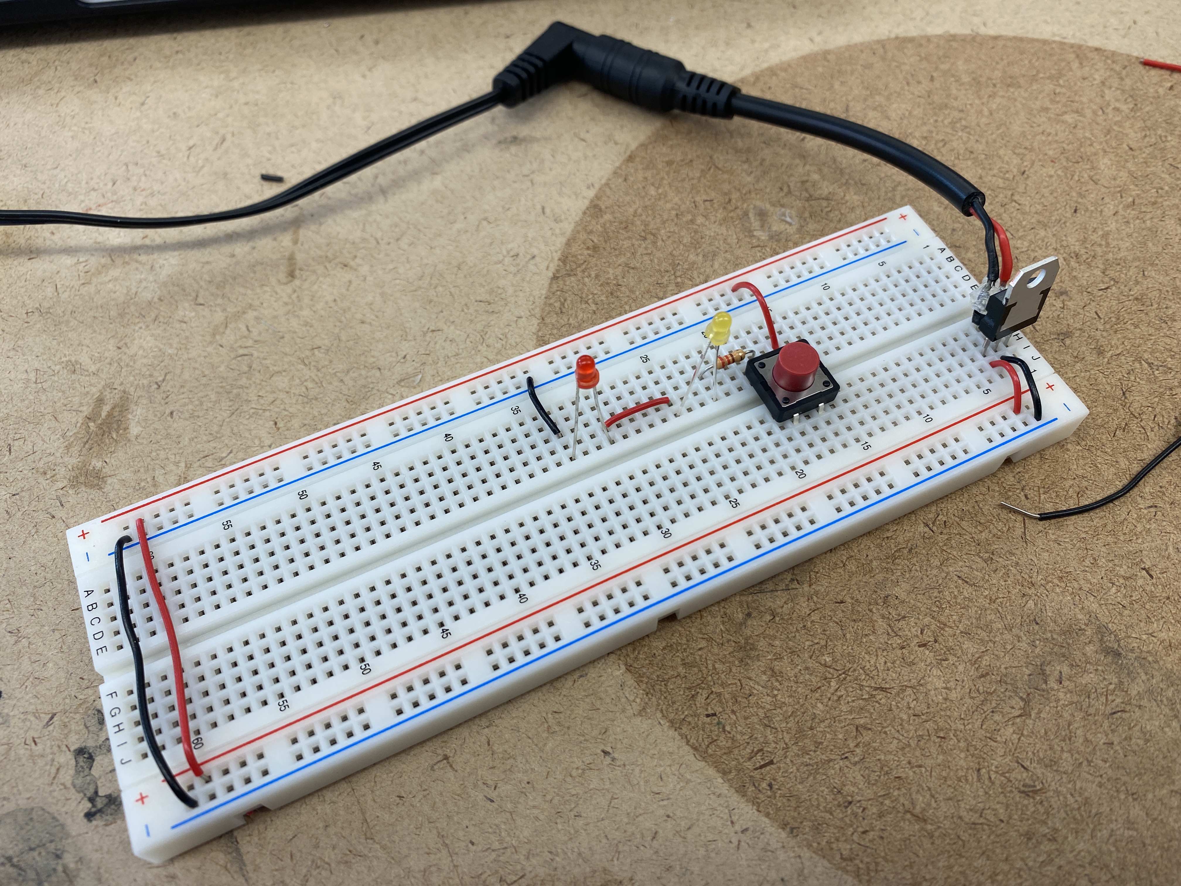 the breadboard's voltage bus. I did a test adding a switch and an LED off of the 5V regulator.