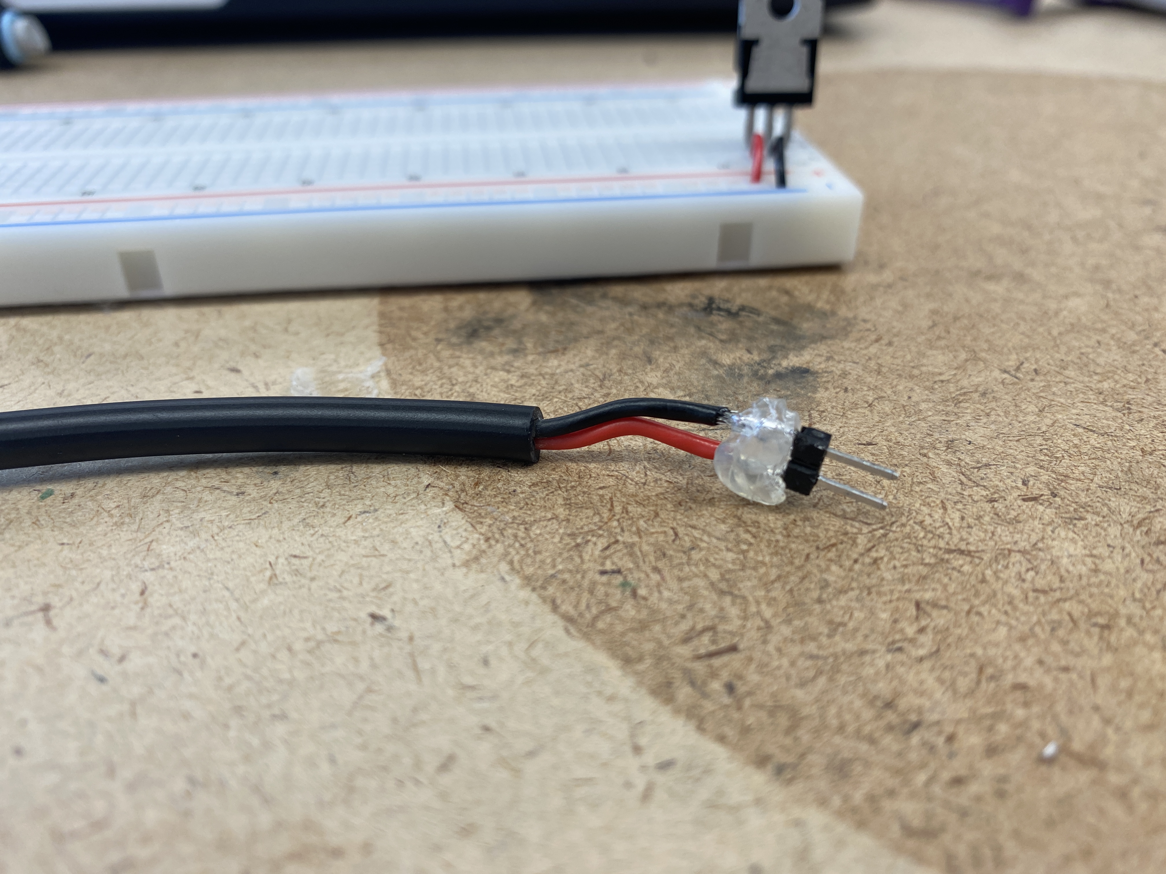 Soldered a DC power jack to two header pins and covered the connections in hot glue to prevent