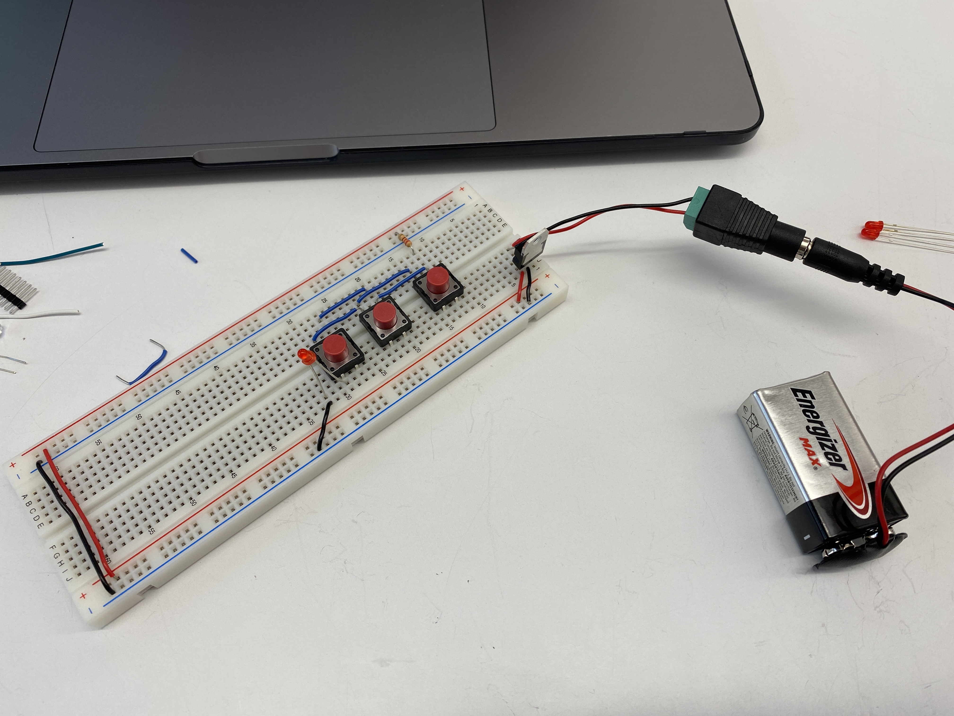 With the three switches in parallel, any one of the buttons will light up the LED.